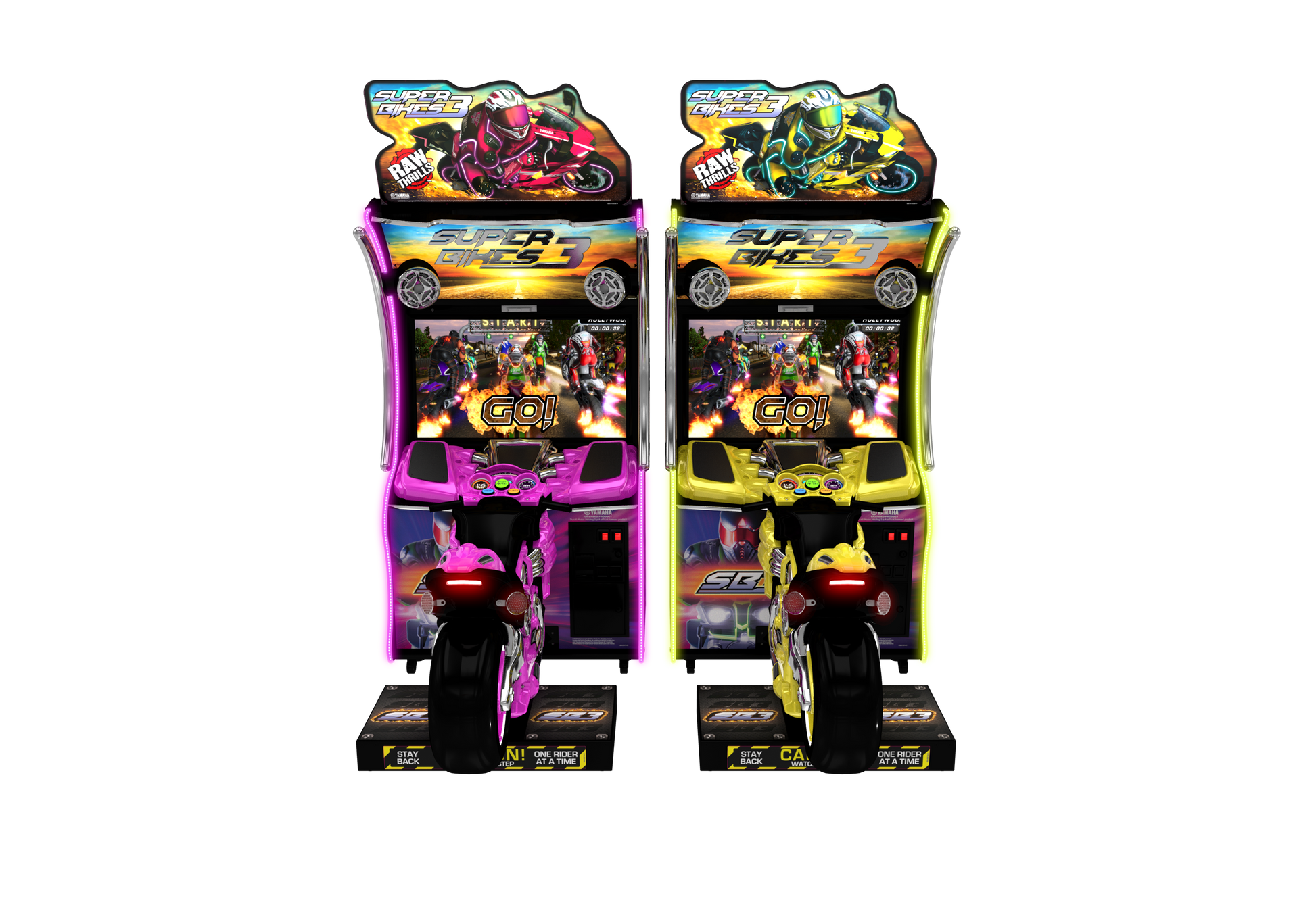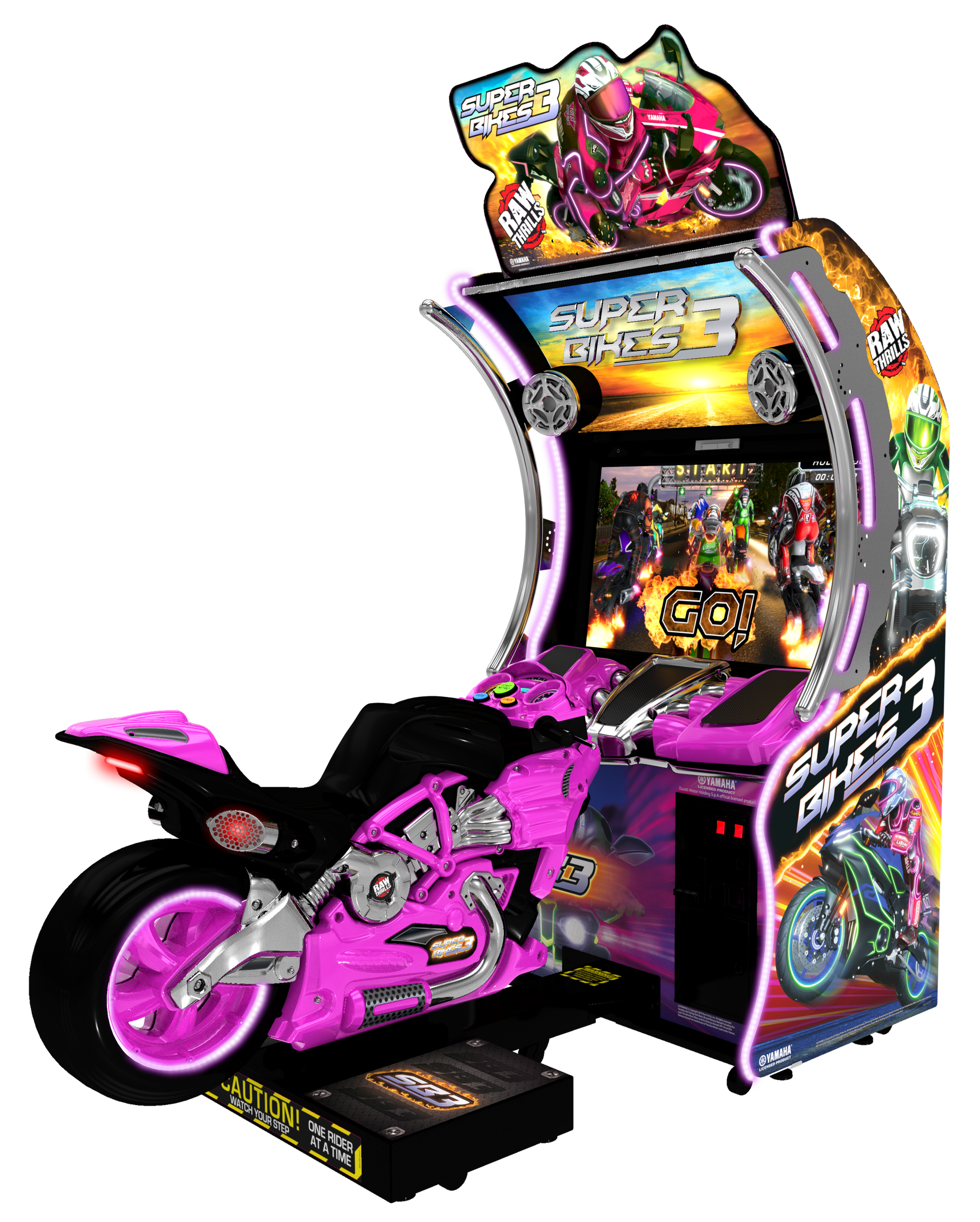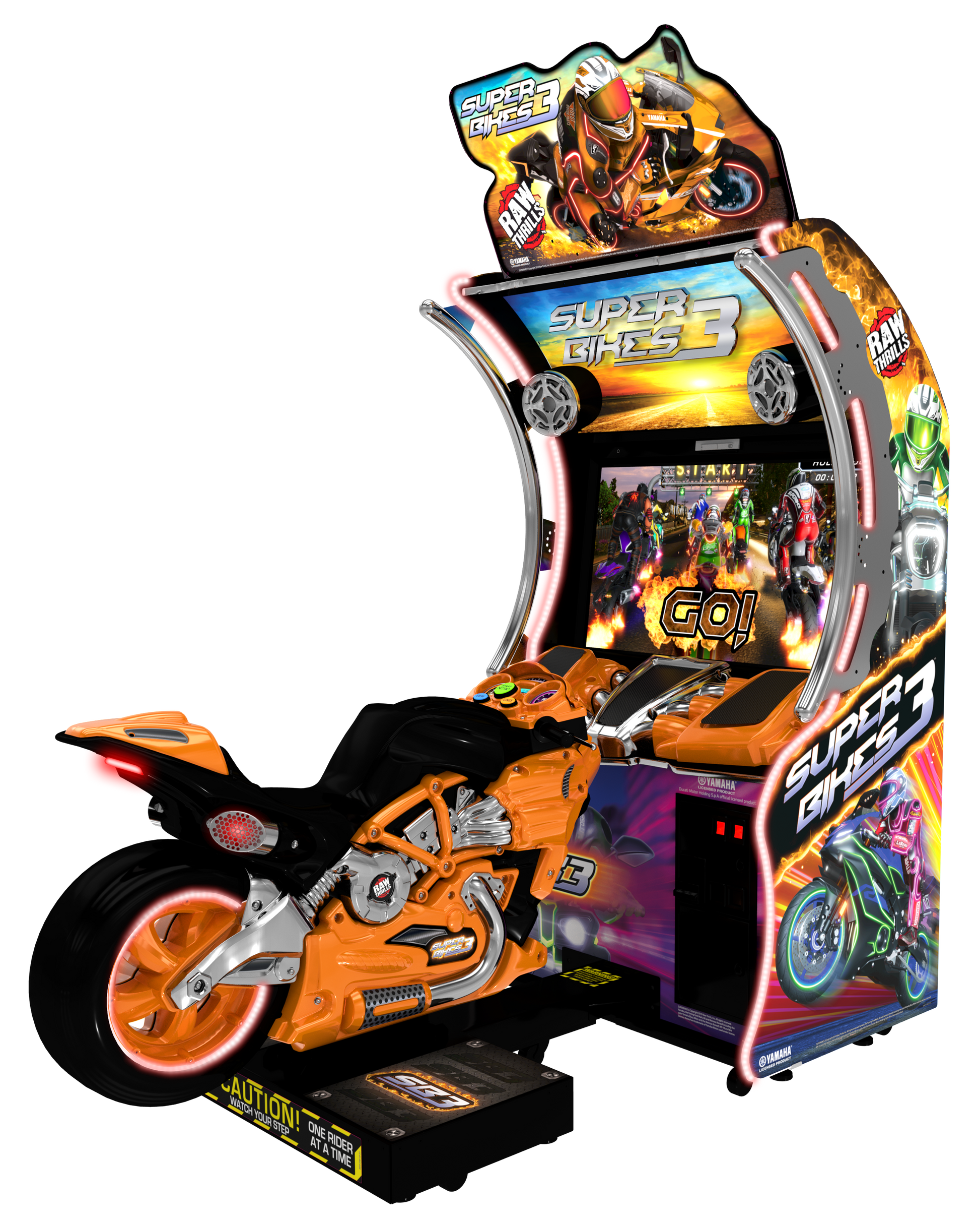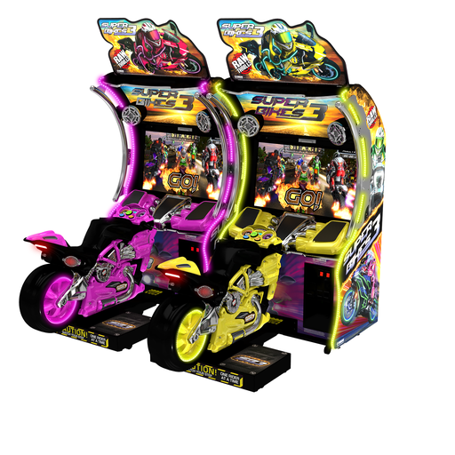 Raw Thrills introduces the latest iteration of the highest-earning motorcycle racing franchiseever: Super Bikes 3TM. Redesigned from the ground up, Super Bikes 3TM features all-newcabinetry with a bolder, more aggressive look. Featuring 8 all-new tracks and 8 tricked-outbikes, Super Bikes 3TM will refresh locations and supercharge income.